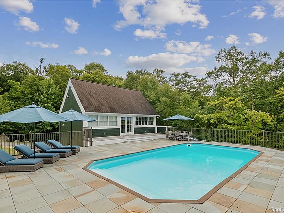 Wooded retreat meets modern comfort in this breathtaking Garrison home, perched atop a gently rolling hill on 5.3 private, park-like acres and abutted by state land. With its blend of soaring ceilings, warm woodwork, and sweeping Hudson River views, this home strikes a rare balance: grand in scale, yet deeply cozy—perfectly suited for both year-round living and weekend escapes. Double barn doors welcome you to a covered porch entry that greets you with soaring ceilings and custom hardwood floors. Past the entry, the main level flows effortlessly, centered around an expansive living room anchored by a dramatic floor-to-ceiling stone fireplace. A formal dining room and covered porch provide front-row seats to panoramic views of the Hudson Highlands, while the chef’s kitchen—equipped with top-tier Miele and Viking appliances—opens to the deck for effortless indoor-outdoor dining and entertaining. Nearby media room adds a quiet, intimate space for movie nights or unwinding with a book. Upstairs, french doors open to a private balcony, ideal for coffee with a view at sunrise or stargazing at night. The dreamy primary suite is a private sanctuary, boasting vaulted ceilings en suite spa bathroom with soaking tub and spacious vanity. Three additional bedrooms and two full baths mean flexible options for family, guests, or a flexible work-from-home setup. Walkout lower level includes a half bath and open rec space perfect for a home gym, playroom, or additional living area. Outdoors, enjoy a beautifully sited heated pool surrounded by natural landscaping and peaceful wooded views. Just steps away, a one-bedroom guesthouse above the detached garage offering privacy and comfort for visitors, extended family, or creative pursuits. Luxurious, private, and surrounded by nature, yet only minutes to Metro North, Cold Spring village and endless outdoor adventure, this home captures everything that makes the Hudson Valley so special.