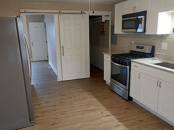 2 Bed 1 Bath 700 sqft available now. The building and unit was remodeled in January 2024. This modern 1st floor apartment unit comes with upgrades such as Granite kitchen countertops, built in dishwasher, fridge, built in microwave, on site laundry, and off street parking. Come enjoy the new vinyl plank flooring while you enjoy lower utility bills for heating and cooling your unit with modern insulation in the building. The newly built kitchen and bathroom comes with a clawfoot tub while the vanity, sinks all come with new modern fixtures. The unit also features barn doors for a modern aesthetic. The unit features, 1 bathroom, an eat in kitchen, and 2 bedrooms with plenty of windows to enjoy the afternoon sunset. Additionally one of the bedrooms can be used as a living room for more space to stretch out. Month to Month lease only. Owner pays cold water and sewer, tenant is responsible for all other utilities including gas, and electric. One off street parking space available. No smoking. 1st Months rent and Security due at signing. Upload proof of income (30 days of paystubs) and proof of funds for security and 1st months rent with application.
