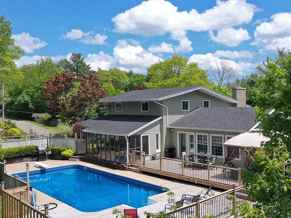 There’s a lot here to talk about. With over 3000 feet of total living space, this multi level home has four bedrooms, three bathrooms,a gourmet kitchen ,open concept living area with cathedral ceilings and patio doors that open onto a inground swimming pool with brand new decking. The principle bedroom has an ensuite propane fireplace walk-in closet and its own private deck.Several steps up are three more bedrooms and a full bath.The lower two levels offer a separate entrance and two rec rooms, ample storage space and plenty of potential for a home based business. There is a large workshop around the back of the house and a private yard with flowering trees and shrubs along with a storage shed for the garden equipment. Some of the recent improvements include two new heat pumps, new bedroom carpets, new decking around the pool renovated upstairs bath and most of the interior rooms have been freshly painted. Only five minutes to Bridgewater in a quiet neighbourhood and with very reasonable county taxes.