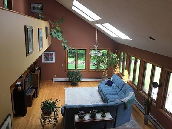 Secluded custom Contemporary with well-established, low maintenance perennial flower beds for you to enjoy while relaxing on the front deck in total privacy! This custom- built home is certainly not a "cookie-cutter" property, with its open floorplan and vaulted ceilings, situated in the center of 6 acres of paradise. Incredible open floorplan with well-thought use of natural lighting and spatial arrangement of rooms! Too many features to list, from the over 6 acre parcel of land with plentiful gardens and perfect spots from which to enjoy them, to the dark room in the basement to the bonus finished space on the lower level! The Master Suite is separated from the other bedrooms, offering more privacy and even a space for a home office, or dressing room or nursery! Top that off with His and Hers walk-in closets and a large master bath with Sauna! Updated heating system, roof, hot water & central air. Accompanied showings please.