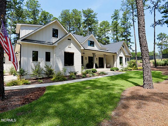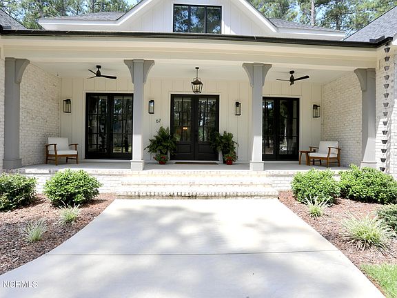 This custom design/built home by Latitude Builders is a one of a kind! Completed in 2021, this one floor living plus bonus room has an exceptional floor plan with ten foot ceilings and fabulous indoor and outdoor living spaces. Amazing golf course and water views. Located right next to the Pinewild Clubhouse on the 18th hole of the Magnolia course. It offers the most convenient location there is for those that want to stroll to the club for lunch or an evening cocktail! PINEHURST CC membership available with buyer to pay transfer fee. You will love the wide plank engineered hardwood white oak floors. Very scratch resistant. The sitting room off the entry features a solid wood barn door for privacy. The vaulted ceiling in the kitchen and great room is highlighted by a beautiful ridge beam. This space is open and welcoming. The kitchen offers Kitchen-Aid appliances with a ZLine dual fuel range and wall oven. The soapstone countertop and quartz backsplash are striking and the large walk in pantry offers extra space for small appliances for the ultimate in organization. The Great room has a cozy gas fireplace with a modern custom surround mantel and leads to the covered patio and screened in porch with its own gas fireplace, TV hookup and a gas grill and cook zone. Step down to the outdoor dining area! These outdoor spaces are truly the ultimate place to entertain! Other details about the house include Jeld-Wen black metal clad casement windows with a 20 year warranty and 3 Carrier HVAC units with 3 climate zones. The Primary Suite has a vaulted ceiling and two separate closets, custom woven blinds with remote control and a large soaking tub in the bath. All bedrooms have ensuite baths with walk-in showers and Quartzite stone tops. The oversized garage has a 3rd bay for a golf cart. SO many features in this custom home...too many to mention here! Please see the Feature Sheet in the document section. Furnishings available separately. Come home to 67 Devon Drive!