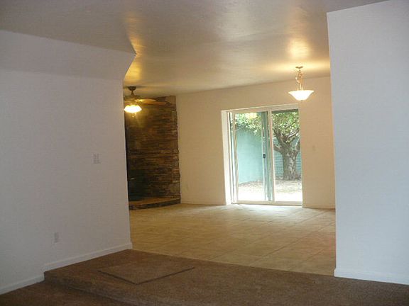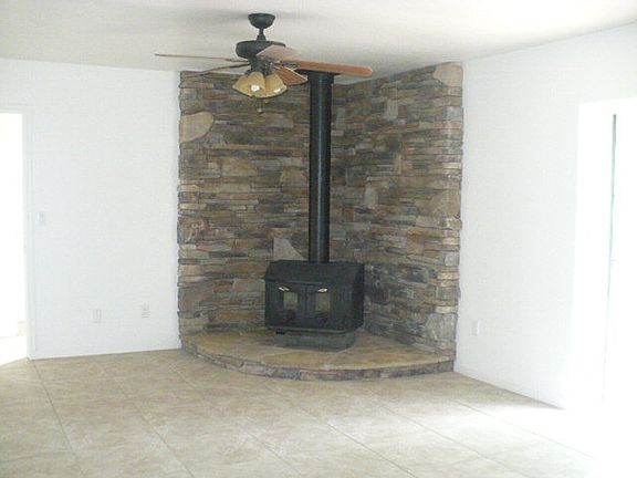 Sturdily built block constructed one level ranch style home fully furred out, dry walled and newly textured Santa Fe style, coffered ceiling in recessed living room, large spacious bedrooms with walk in closets, large kitchen dining area features wood stove w/ stacked stone hearth and front and back covered patios. Totally remodeled including new shingles, paint i/o, cabinetry, counters, dishwasher, sink, tile flooring in kitchen dining and baths, and new carpeting. Move in condition. Level lot, fruit trees, fenced back yard.