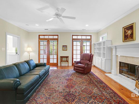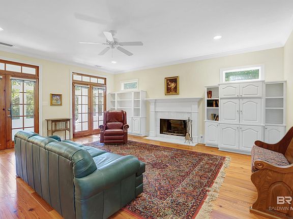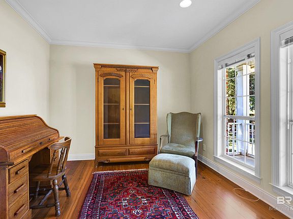 Welcome to this charming, custom-designed brick home built by Steve Sloan located in a wooded, serene neighborhood just a mile from downtown Fairhope and Mobile Bay. The main level includes beautiful crown molding and 9-foot ceilings. Reclaimed wood flooring spans the great room, office, and primary bedroom, with split brick flooring in the kitchen, dining area, and laundry. The spacious living room includes a gas-fired wood burning fireplace with custom built- ins on both sides and two sets of solid wood French doors that open to the enclosed sun porch. The generous primary bedroom includes a large walk-in closet complete with built-ins, plus an en suite bathroom with double sinks, a separate shower and soaking tub, plus three storage closets. The kitchen includes plenty of cabinet storage and a walk-in pantry. The large dining area, which opens to the kitchen, lets in plenty of natural lighting on three sides. Off the kitchen you'll find the laundry area, a half-bath and two bonus rooms that would be perfect for an additional office, hobbies, or a TV/playroom for the kids/grandkids. Upstairs includes a full bath and two spacious newly carpeted bedrooms. The attached two- car garage includes a separate storage room that provides convenience and additional storage space. You'll definitely want to see for yourself what this home has to offer.