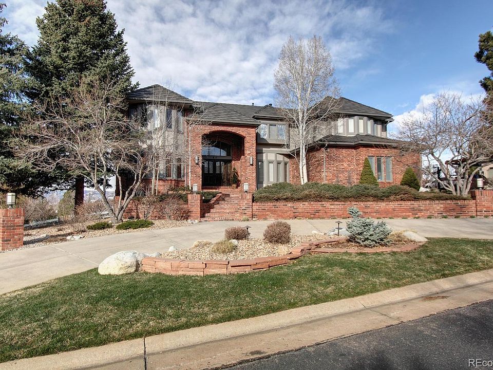 Location, location, location ... Views, Views Views! Panoramic Front Range views from expansive decks that will have you enjoying sunsets all year long .. main level affords finished covered year-round use. Magnificent home is situated on a .59 acre lot in the exclusive Falcon Hills, gated & guarded community. Custom front doors open to grand entry. Gorgeous hardwood floors throughout upper & main floors. Arched entryways lead to formal dining room w/coffered ceiling. Executive office w/classic wood built-ins . Curved staircase leads to a bridge overlooking the great room w/2-story ceilings, large windows and fireplace w/hand carved mantle. Gourmet kitchen w/slab granite, custom cabinets, butler's pantry & breakfast nook. Master suite w/sitting area, fireplace, built-ins & 5-piece bath w/3 headed steam shower. Game room, theater room, wine closet, wet bar, 2 bdrms w/Jack 'n Jill bath on walk-out level that leads to large patio w/hot tub. All 3 distinct levels of the yard are professionally landscaped. Circular drive w/side-load garage which is finished w/custom built-ins and flooring.