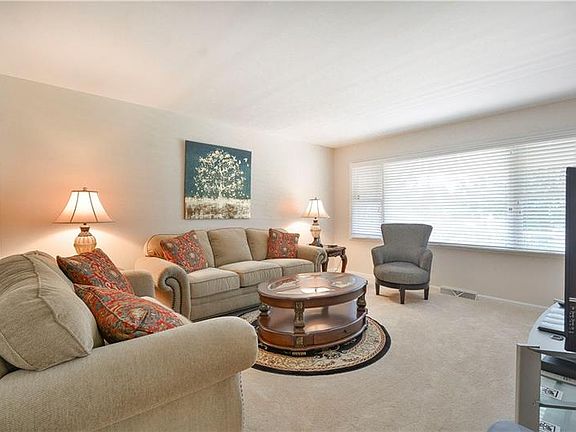 Just Move In!! Brick Ranch situated on private homesite completely remodeled. Aggregate stone porch welcomes you to this lovely ranch. Ceramic foyer leads to open dining room with bay window formal living room and all new carpet throughout. Enjoy cooking in this new cherry kitchen with granite countertops/new stainless appliances and ceramic flooring. Family room is adjacent kitchen with gas log fireplace/mounted TV with sliding door to patio and level treed yard. Laundry made easy with laundry room on main level. Master suite with updated master bath also 2 additional bedrooms with storage plus new Hall ceramic bath. All appliances are newer/carpet/interior doors& painting/baths/Kitchen/powder room and HVAC. Full basement with 9Ft ceilings 27x44 plus 2 car garage with high ceilings. Quality throughout. Taxes and lot size are based on Realist. Home Warranty