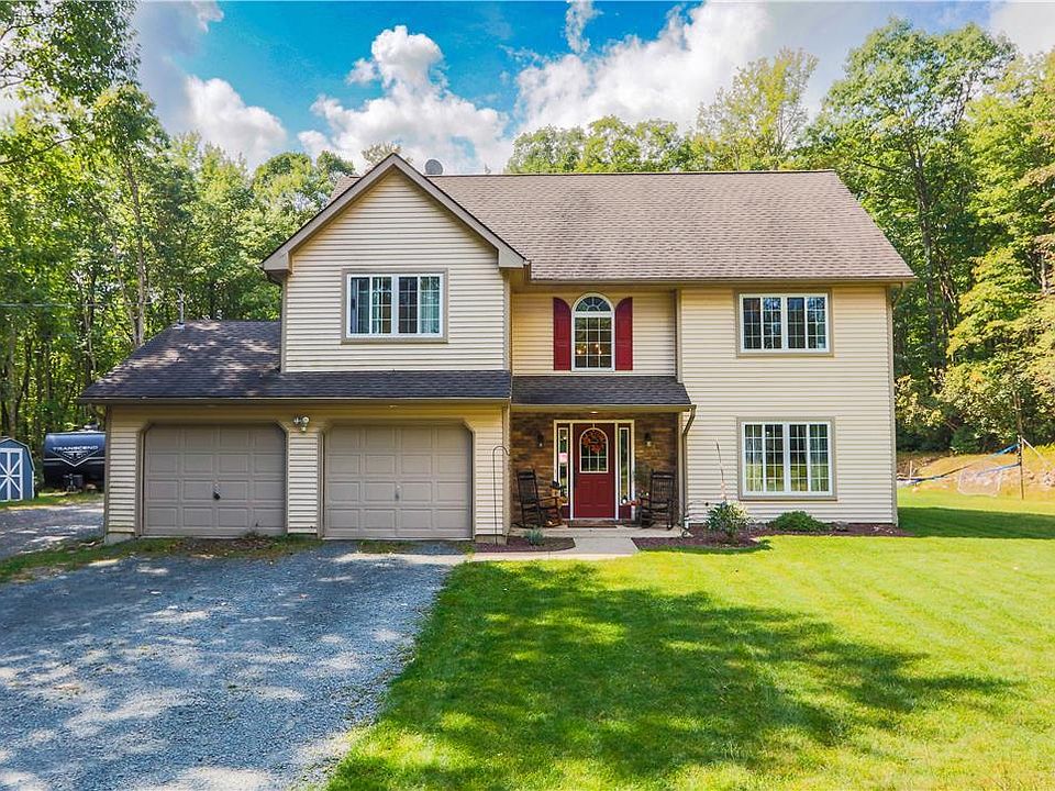 This Beautiful colonial is located in bucolic Pleasant Valley West. Surrounded by rhododendrons and old forest, this home has everything you're looking for. From a family room with a fireplace to a spacious kitchen the open concept first floor makes entertaining easy. Upstairs you'll find 3 bedrooms including a primary suite with a large tub separate from the shower and bluetooth speakers. The third floor if this beauty is also a finished space that could make for a nice game room. Outside, enjoy a partially cleared acre with a 2 car attached garage and a heated 2 car detached garage and a pool. Low dues in an ATV friendly, lake community. Schedule your appointment today.