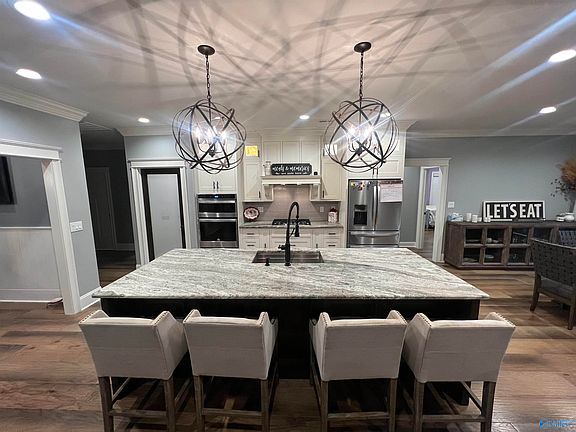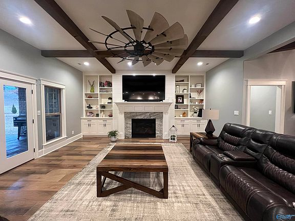 This premier custom full brick home is offered for purchase for the very first time, in Guntersville city limits. This home is located in Sycamore Cove, one of Guntersville's finest neighborhoods & only minutes from public boat launches. Features of this home include: 4 beds, 3 baths, custom designer kitchen w/granite countertops & stainless appliances, wood & tile floors, coffered beam ceiling in great room, primary bathroom w/tiled shower & separate tub & LED lighted fogless mirrors, gas log fireplace w/built ins, sink & cabinets in laundry room, on-demand natural gas water heater, gas heat, covered back porch with outdoor fireplace, stamped concrete, all this on over a half-acre lot.
