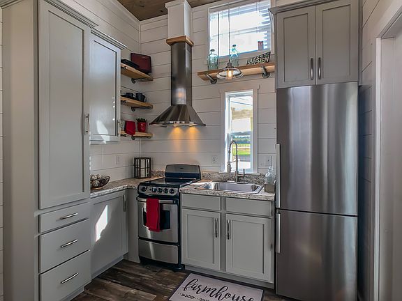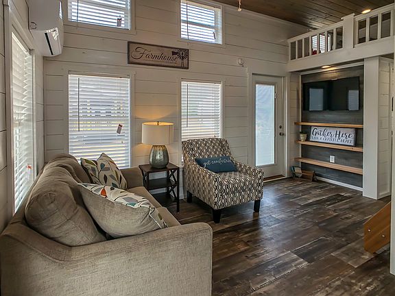 Efficiency floorplan! 4 separate sleeping spaces and 1.5 baths in 399 sq. ft!Two bedrooms on main level and two separate spaces in split loft above, custom built-in storage throughout.Euro kitchen with stainless steel appliances and upgraded vent hood. Unique two-color exterior and generous 10' covered front porch. Lovely homesite in a newly developed area with reduced monthly lifestyle fee.