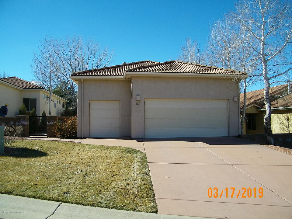 Ranch Style Home Spacious living room with gas fireplace, gourmet kitchen with solid maple cabinetry, Large master suite with sitting area, large second bedroom, two large walk-in closets, two full and one half baths, carpet and ceramic tile flooring, ceiling fans, washer and dryer, and lots of upgrades. Professionally landscaped, low-maintenance fenced courtyard with in-ground timed sprinklers and drip system. Two private patios (1 covered). Extra large 2 1/2 car heated garage with work space or golf cart bay.