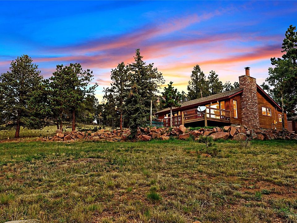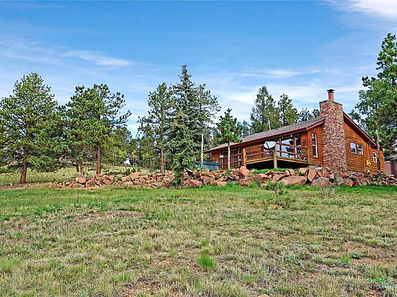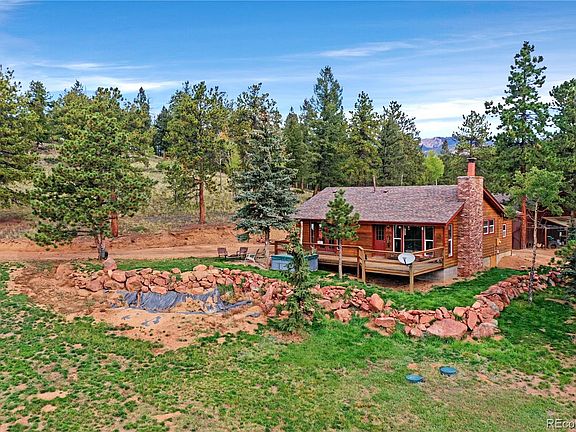 This charming 2-bedroom, 1-bath retreat in Deer Creek Valley Ranchos offers breathtaking views of the surrounding mountains and a taste of the ultimate Colorado lifestyle. The home features a sleek, efficient kitchen and a cozy living room with a striking stone fireplace and wood-burning insert. Pitched ceilings with exposed beams add character and warmth. Step through French doors from the primary bedroom onto a spacious deck—perfect for morning coffee or evening stargazing. Below, unwind in the hot tub as you take in the natural beauty from all directions. The primary bedroom also offers a generous walk-in closet for your personal storage needs. Outside, you'll find nearly 5 acres covered with Aspen and pine and a detached 2-car garage for added storage and workspace. There's plenty of space for horses and room to park your motorhome and equipment. You'll also find a fenced chicken coop and unusual rock outcroppings. Whether you're seeking a peaceful getaway or a full-time residence immersed in nature, this property delivers a rare blend of privacy, functionality, and mountain charm. View the pictures and virtual tour and call today for your personal showing!