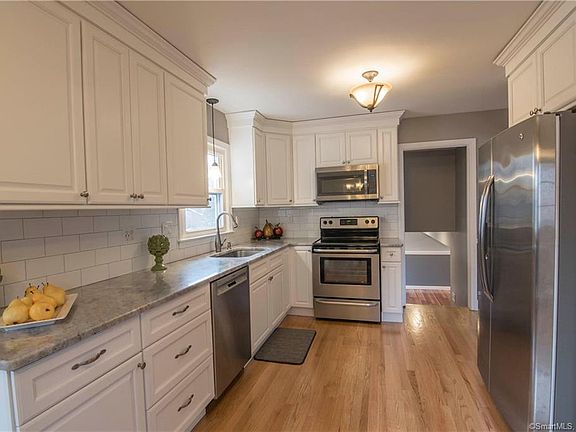 Beautifully kept and completely updated home located on 0.50 acres in a quiet desirable neighborhood. This stylish home offers top quality updates, gleaming hardwood floors throughout, and lots of natural light from ample windows. Enjoy gatherings in the formal living room which features stone-faced fireplace that adds ambience to the room. Completely gorgeous and spacious kitchen with new cabinets, granite counters and stainless steel appliances is great for entrertaining. The dining area off the kitchen opens to the fabulous 3 season sunroom ideal for relaxation and entertainment. Sunroom features hardwood floors, cathedral ceilings and has easy access to the deck and yard. The completely finished lower level with a walk out is the perfect family room, man cave or game room; offers a half bath and a wood burning stove for low heating costs. The sqft includes 195 sqft of the sunroom. Key location just minutes away from highway, shopping and dining. Close to Quinnipiac University and Quinnipiac River State Park.