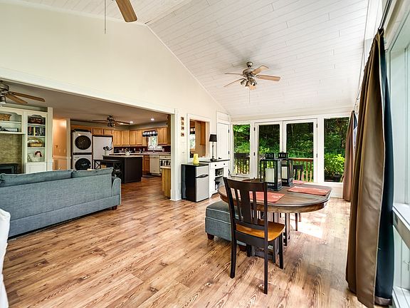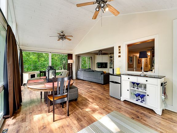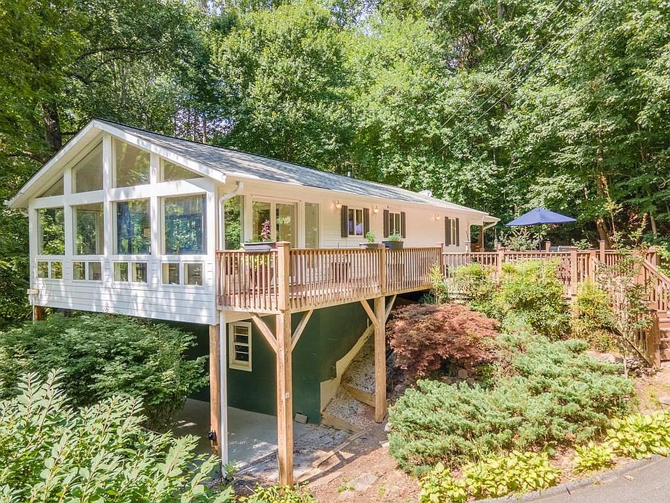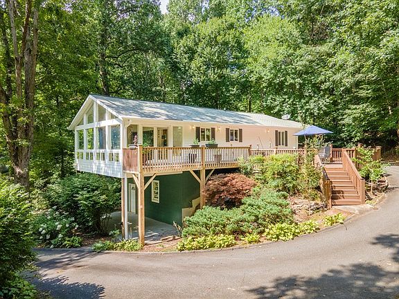 Conveniently located within walking distance to the Little Tennessee River for fishing and canoeing, close to brewery, school, shopping and restaurants. This private 2-bedroom, 2-bath home sits on 1.12 acres with paved roads leading all the way to the house. The lot offers ample open space, ideal for a garden, RV barn, or swimming pool. Inside, you'll find a cozy home with a large great room with cathedral ceiling and plenty of windows, filling the space with natural light. The home is equipped with two gas heaters, central heat and air, an on-demand water heater, and high-speed internet for modern comfort and bathrooms have been upgraded with ceramic tile. Outdoor living is enhanced by a deck overlooking a koi pond and lush landscaping, providing a serene and picturesque setting. The partial basement offers great storage options, while two carports provide shelter for your vehicles. This charming home combines convenience, comfort, and beautiful surroundings, making it an ideal retreat.