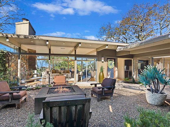 An Orinda Sanctuary with Views, Privacy and Proximity to Town! This architectural gem boasts walls of glass bringing the outdoors in, creating a peaceful and private setting, with views of the Orinda Country Club and surrounding hills. One level and updated, the gourmet kitchen has stone counters, top appliances and an abundance of storage at every glance. The living and dining room float between the front and backyard landscapes while the aesthetic appeal of the timeless copper fireplace hood anchors the open living spaces. The den off of the kitchen may be an office or easily transformed into a 3rd bedroom. Zen setting with a blend of mid-century and modern influence, the grounds are environmentally conscious with a low maintenance focus. The fire pit seating area is a focal point and is complimented by the fountains, river rock & grand rock wall which leads to a secluded gardener's haven. This well-maintained, light-filled home includes bamboo floors, IPE decking, A/C, newer furnace, EV charger and more. Walk to Lake Cascade, downtown Orinda, BART & farmers market. Located off Orindawoods. More info 67LaCuesta.com.