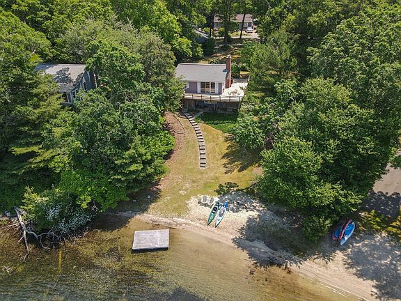 WATERFRONT: Adorable year-round cottage directly on Jenkins Pond, complete with your own private sandy beach. This inviting home features 3 bedrooms, 2 full baths, with a perfect blend of comfort and charm. The main floor boasts a large open living room, a dining area, fireplace, and a cozy sitting/viewing area. Enjoy breathtaking views through the triple slider doors that lead to a substantial wrap-around deck, offering nearly 850 square feet of outdoor living space. Newer custom kitchen with quartz countertops, stainless inlaid sink, electric stove, dishwasher, microwave, and more. Three bedrooms and a full bath complete the main floor. A spiral staircase accesses the lower level and is a walk-out space that features an enormous bunk room/playroom that can be tailored to your needs. A second sitting area with views and walk-out access to a patio. Convenient laundry room and another full bath. Large utility closet houses the gas heating, hot water tank, electrical, etc. Two-car detached garage for ample storage and parking. Recently updated Title V septic system. Easy access to the beach via a set of steps and a raft for water activities. Don;t miss out on this waterfrront gem!