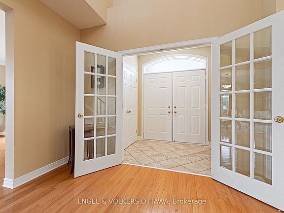 A distinguished 5-bedroom, 5-bathroom estate situated on one of Kanata Lakes' most expansive walkout lots - over 13,000 sq. ft. of exquisitely landscaped grounds complete with a grand in-ground pool and manicured gardens. The grand double-door entry opens to a soaring two-storey foyer with ceramic tile, French doors, and a sweeping hardwood staircase. Rich hardwood floors flow through the formal living and dining rooms, filled with natural light and framed with crown moulding. The spacious kitchen features solid wood cabinetry, granite counters, a central island with bar seating, and stainless steel appliances, connecting seamlessly to the bright breakfast nook and elevated rear deck. The adjacent family room impresses with cathedral ceilings, a gas fireplace, and full-height windows overlooking the backyard. A stylish powder room with built-in cabinetry completes the level. Upstairs, the expansive primary suite offers hardwood flooring, treetop views, and an ensuite with a soaker tub, glass shower, and double vanity. The two additional bedrooms are generously sized, with a Jack-and-Jill bath between them, and a third 4-piece bath serves the loft-style office featuring custom built-ins and overlooking the great room below. The fully finished walk-out lower level offers incredible flexibility, with a large recreation room, gas fireplace, and lower patio access. A private bedroom and 3-piece bath create a comfortable guest or in-law space, while a large storage area adds convenience. The backyard is truly a private oasis, complete with an in-ground pool, interlock stone patio and pool deck, firepit area, lush gardens, and mature cedar hedging. This sought-after community is known for its beautiful executive homes, quiet cul-de-sacs, mature trees, and quick access to a suite of amenities and transit points. This is your opportunity to call one of the city's most desirable neighbourhoods home!