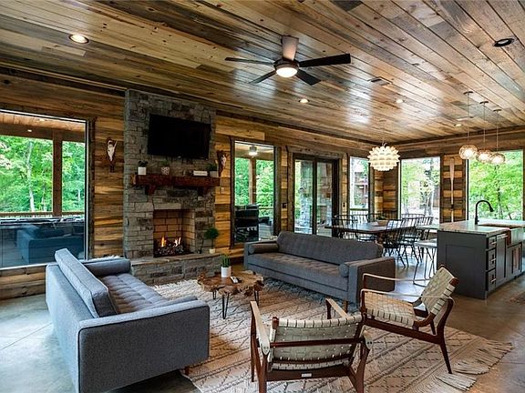 Storybrook is a 5 bed/5.5 bath modern cabin with a large bunk/game room that can comfortable sleep 17 guests and is situated along a beautiful rolling creek. Upon entrance, you'll instantly fall in love with the stunning woodwork, custom finishes and shiplap accents. This property features an open concept floor plan, floor to ceiling windows and a beautiful stone fireplace. The kitchen features fresh white cabinetry, sleek stone countertops and stainless steel appliances, including double ovens and flat-top stove. The upstairs and down stairs both feature King suites and the bunk/game room has 3 triple bunks and a wet bar. The outdoors features a deck great for watching the sunrise and fall. The back deck is a great pace to gather to grill, hang out of sit by the fireplace. You can also enjoy sitting around the fire-pit and kids can enjoy the jungle gym on site. This would be a great investment opportunity and is located within minutes of everything Hochatown has to offer.