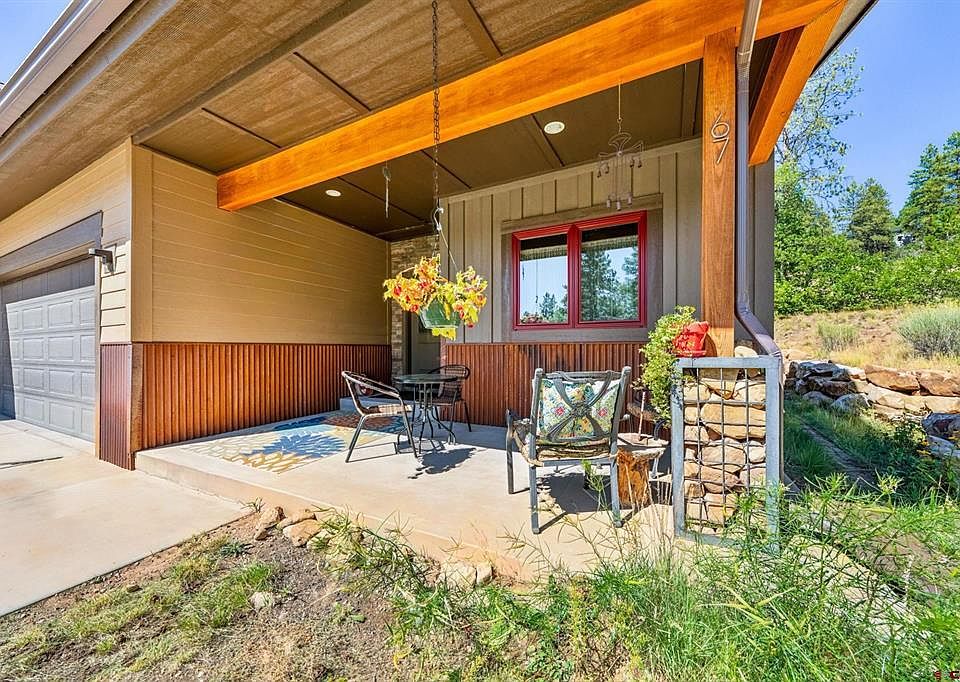 Presenting a beautifully maintained single level townhome nestled in the tall pines just east of historic downtown Durango, Colorado. Surrounded by the elements of blue skies, fresh air and flowing waters...you will find yourself in your element. The Elements subdivision was designed to offer luxury and value. Design features include a spacious primary bedroom suite on the main level with walk-in closet, granite slab counter, dual vanity and gorgeous tile shower with glass door. The open kitchen includes a stunning arrangement of granite slab counters, high-end cabinetry, accent paint and stainless appliances. Lots of windows throughout the home for natural light. The details make all the difference with built-in bench with drawers at the front door, furniture niches, art walls, gas fireplace with mantle, hearth and slate tile surround, covered front and back porches and abundant storage. Enjoy an oversized 2 car garage, mud/laundry room with utility sink, storage and cabinets. Luxury engineered hand-scraped wood floors and brand new carpet in the bedrooms are complimented by stain grade doors and trim throughout. Exclusive fly-fishing river access and hiking trails offer the serenity of the mountains, while the Community Lodge and the social association schedule bring neighbors together. Community amenities offered by the Edgemont Highlands master planned community include almost 200 acres of dedicated open space, a gorgeous Community Lodge with full kitchen and an herb garden, 10 miles of maintained hiking trails and access to a mile and a half of Florida River for hiking and fly -fishing. This is the best value today for single level lock 'n leave living close to downtown, but nestled among the tall pines!