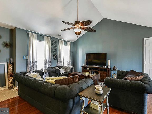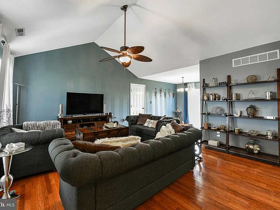 New-trend colors, nearby conveniences and notch-above space in this N. Chimney Top Lane home! Just one turn off Rt. 13 with a host of amenities, down the road from Killens Pond State Park, 20-minute jaunt to Lewes Beach and direct hour commute to Wilm., this tan-siding, burgundy-shutter one-level living home features bump-backed garage and up-front large covered porch, perfect for 2 rocking chairs. Ceramic-tile foyer is quaint, but wide enough for sofa table and mirror. Open space and contemporary floor plan are beyond and embrace you with its vaulted ceiling and cool-tone color of slate blue. Ceramic tile floor quickly transitions to hardwoods and paired with brown wicker bamboo-leaf ceiling fan, warm main room. Large DD coat closet sits to right. One sizable wall is directly ahead and series of ladder-like shelves line the wall attesting to wall~s big space and offering places for both the practical and pretty. 2 single windows reside on front wall, while expansive apex-ceiling, accent wall showcases thick slate-blue stripes in alternating matte and glossy finishes. The effect is ever-so subtle, yet this display of texture brings interest to this room and, thanks to home~s ~L~-shaped configuration, to DR as well since it is connected to and directly behind LR. DR is large-enough and boasts continued hardwood floors, black wrought-iron/pewter chandelier and glass sliding doors. Nestled between FR and DR is access to 1-car garage with one wall of built-in shelves and corner shelf. Great extra storage! Merely ~-wall separates DR from kitchen, keeping conversation between all three rooms open and easy. No-hardware oak cabinets allows one to appreciate the rich wood, and with room above it~s easy to bring personality and splashes of color to room with display of plates, baskets and greenery. Gray countertops blend with Frigidaire black/SS appliances, and there is plenty of room to prep and clean up from meals. Hall from FR leads back to big hall closet and DD that easily slides back to reveal W & D with room for dual-cabinet adjacent, great for storing detergent and softener! Two secondary BRs with angled entrances are mirror images of each other and both tout dove-gray carpeting, rich slate-blue paint, roomy DD closets and almost floor-to-ceiling windows. BRs have easy access to hall bath with beige paint, tub/shower and bead-board style tan/white vanity which coordinates perfectly with the white chair rail and tan beadboard that graces the wall. Little details make big impact! MBR shows well and makes luxe impression! Steel-gray carpeting complements charcoal-painted walls, chair rail adds pop of white and crystal chandelier ups the elegance! Even the spacious walk-in closet has a mini crystal chandelier! Master bath echoes gray color and features dual-sink vanity, sizable shower and full linen closet. Glass sliders from DR lead out to nice-size patio, perfect for weekend BBQs and where relaxation is required! Great space. Great value. Great find in Felton!