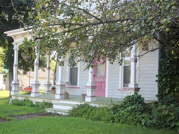 Village Victorian on over half an acre of a secret garden type of yard. So many porch spaces! Generous sized kitchen with center island, space to eat in the kitchen, yet the house also has a formal dining room. Room above kitchen has it's own back staircase, currently used as a craft room, or could be an office or extra bedroom. Downstairs office as well, could also be an extra bedroom. Front sitting room with bay windows plus family room in front of house. Upstairs are 3 bedrooms and a full bath. Carriage barn/garage. Sidewalk in front of house in to the village. Village municipal water.