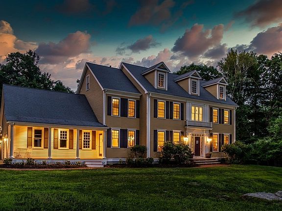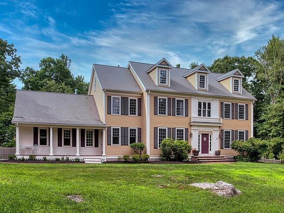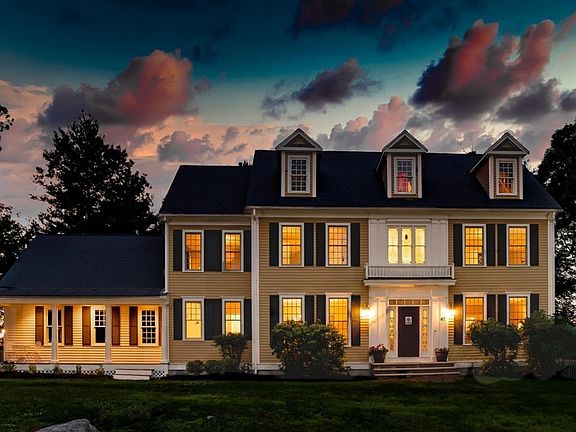 With its triple dormers and pillared porch, this impressive four-bedroom colonial has great curb appeal and with its unique features, it has charm inside as well. The dining room boasts a sculptured ceiling adorned with a medallion. The granite kitchen flows out to a sprawling back deck overlooking a private backyard. The back hall gives access to a half bath, an office, and laundry. And the family room is superlative. With six twelve-over-twelve windows and two skylights, this room brings in the sunshine, and on cold nights, the fireplace charms the room with its glow. In the upper hallway, past a triple-pane stained glass window is the door leading to a walk-up attic. On the upper level also find three sizable bedrooms, a full bath, and a master en suite of epic proportions. Besides the master bedroom and bath, the suite includes a separate sitting room, a hallway lined in closets, and another room with built-ins. With its many unique features, this house is charming inside and out!