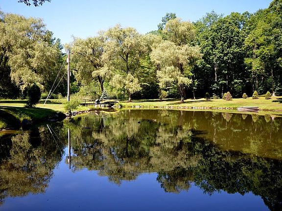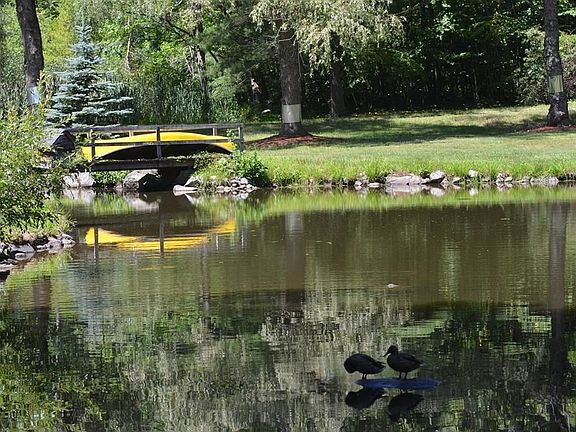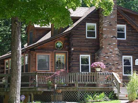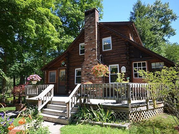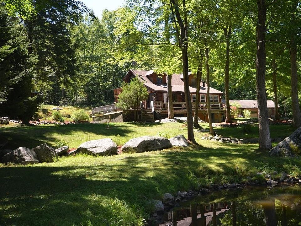 This log home IS Your Retreat, with a large Spring Fed Pond in your front yard! Spend endless peaceful hours watching wildlife that abounds outside your windows! This home has been beautifully maintained, has Solar Electric & Pellet Stove Heat, making it very energy efficient. A New Kitchen has Granite Counters, Stainless Double Sink, Custom Cabinets and New Appliances. The Dining Rm has a Mini-Split HVAC unit and opens onto an expansive Wrap Around Deck for outdoor entertaining. A warm and inviting Living Rm with Wood Fireplace adjoins the family room with a wall of windows overlooking this Amazing Park Like Setting! The office could be a 3rd bedroom! A brand new bathroom with granite counter tops and custom cabinets completes the 1st floor. Both bedrooms have Cathedral Ceilings with fans and 2 closets each, the master has a Mini-Split unit and Juliet Balcony. A Walkout basement is partially finished, with 1/2 bath & loads of storage. 10 MINS FROM NOHO! Truly a One of a Kind Property