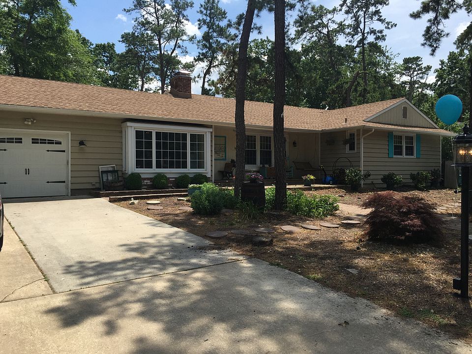Single story 3 bedroom 2 bathroom Grafton ranch home for sale on a quiet street in beautiful Medford Lakes. Newer roof, new A/C, newer heater, brand new gas hot water heater, newer water treatment system, new master bathroom, newer privacy fence in back yard, newer insulated garage door, and updated kitchen and dining rooms in the "fixer upper - industrial farmhouse style". The street was even recently repaved! Home has an outside hot/cold shower for getting rid of beach sand! Back yard has a multilevel EP Henry stone deck surrounded by a new privacy fence and flowering bushes. There is a place for a hammock and there is a large swing set with a rock wall leading to a fort with a slide. There is a small vegetable garden and a separate large fenced in area for pets with access to the house through a dog door. Overlooking back yard is a 4 season sun room/coffee bar/office area with hunter fans and chalkboard walls. There is a black pipe and wood butler pantry and open black pipe and wood shelves to the kitchen. The kitchen has been remodeled with black countertops and white painted cabinets with a tin backsplash. A new steel refrigerator is included. The kitchen boasts black pipe lighting with LED bulbs. The living room is off of the kitchen and has a wood fireplace that was just cleaned and serviced. The chimney has new glass cover, a circulating fan and new pointing and a new metal chimney cap. Surrounding the chimney is knotty pine wood shelves. There is also a theater room which has barn style sliding doors that opens to the large dining room for entertaining. The dining room has a large window and beamed ceiling. One bedroom has a loft that fits two queen sized mattresses and has a seating area. It has access to a large amount of attic storage. The master bedroom has an attached master bath that has been remodeled with a glass enclosed tile shower. There are extra storage closets outside of the master bedroom. The washer and dryer are conveniently located in the bedroom hallway.