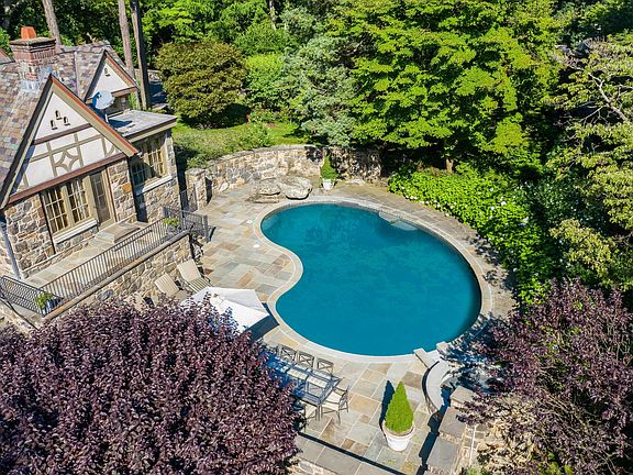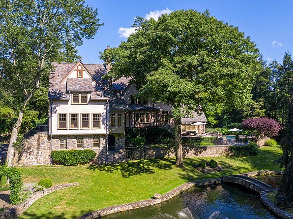 In a magnificent setting, this commanding English manor house showcases exquisite craftsmanship throughout with detailed millwork, architectural integrity, impeccably maintained grounds and a newly installed elevator. A separate, 1-bedroom cottage with full bath and kitchenette was used as a professional office and is one of three private work spaces (with private entrances) on this property. The stone terraces overlook the inviting pool with gardens and park-like grounds filled with specimen plantings, your own vegetable garden and pond with fountain & stone bridges. Filled with light, this beautiful home is the perfect setting for family gatherings at the pool, intimate work spaces, gardening and complete privacy, yet minutes to town.
