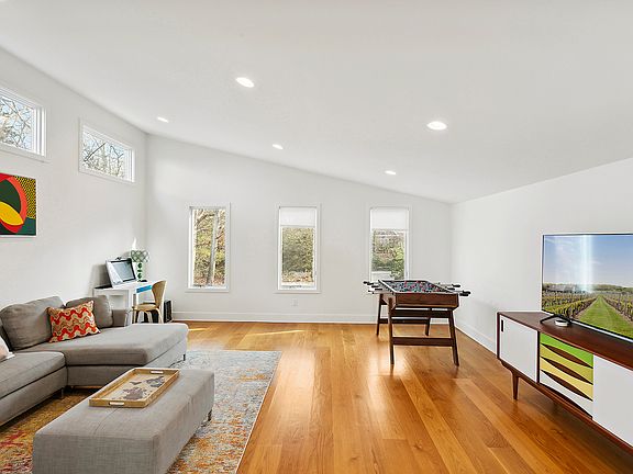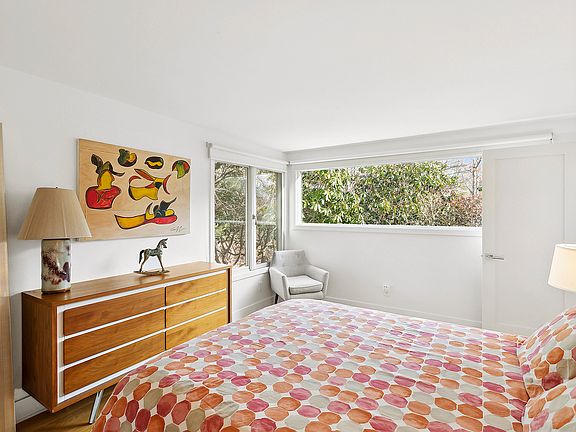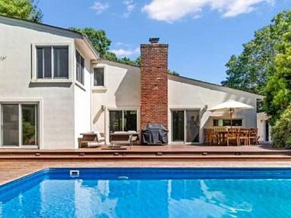 Newly renovated, this open floor plan and bright home has four bedrooms, two baths and one half bath. On the first floor, there is an open concept floor plan featuring a kitchen, dining and living area with double height ceilings and it's flooded with light, two bedrooms, one bathroom, den, laundry room, and a powder room. On the second floor, there are two additional bedrooms and bathroom. Sliders on the first floor lead out to the heated pool and lushly landscaped secluded and quiet backyard. All furnishings are new and modern. Excellent location close to bay beaches and the village.