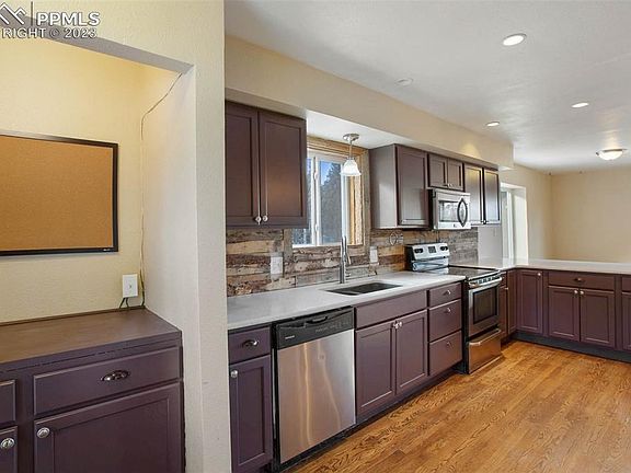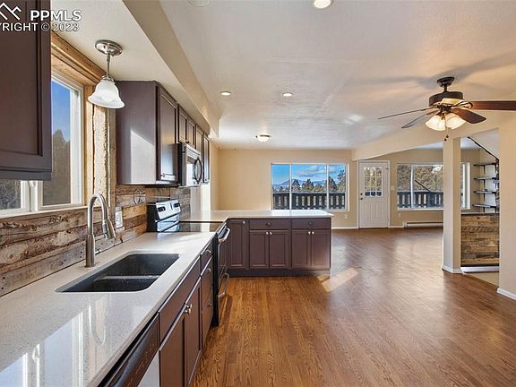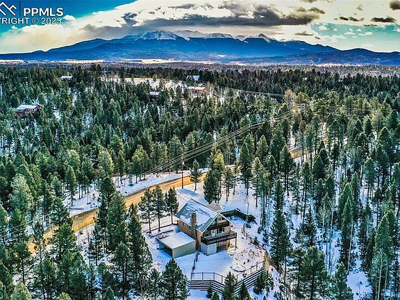 Charming alpine chalet set among a nice mix of healthy aspen and conifers with views of the surrounding mountains including Crystal Peak and Badger Mtn. Surprisingly spacious, this cutie features 5 bedrooms, 3 baths, a large main-level great room plus a roomy family room downstairs. A wood stove insert on the main level and a pellet stove down below help keep the home cozy and heating bills low. Low-maintenance metal roof and stucco siding are accented by wood balconies on both the front and back of the home. Convenient circle drive for easy access from county maintained roads, plus a 2-car metal sided and roofed carport with it's own dedicated driveway. Sturdy retaining walls allow for a level, fenced yard. Nine stocked fishing lakes in this scenic & historic community plus a clubhouse and playground. Great views of Pikes Peak on your short, 4-mile commute to Divide, most of which is paved. This puts you within easy reach of skiing, rafting, fishing in Gold Medal waters, 14ers and everything else we love about Colorado. Here's your chance to realize your dream of moving to the mountains!
