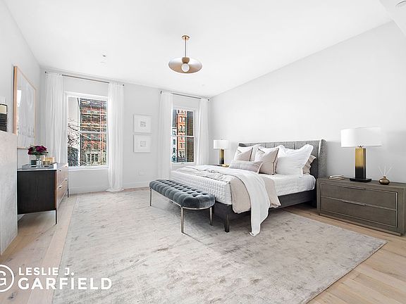 The enormous rear parlor features incredible ceiling heights and a marble-clad fireplace; the front parlor is a study with a wet bar, wine refrigerator, and sink. These rooms are connected by the wide open gallery with a powder room. The second floor above has two sizeable bedrooms, both with en suite bathrooms and ample closet space. A full laundry room also sits on this level.