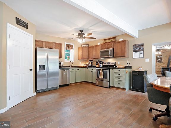 This home offers historic charm and characteristics with 3 bedroom, 2 full baths, basement finished recreation room with stone fireplace w/ gas heater. Living room with pellet stove on brick hearth, hardwood floors and build in cabinets, updated kitchen with lots of natural light. Decks and garages galore and all this on acre lot with Little Antietam Creek at rear of the property. Stocked Creek with trout, you must come view property before it gone!