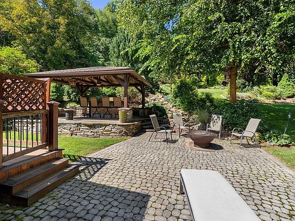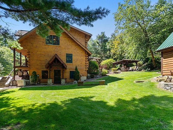 This magnificent Kuhns Bros. Log Home with honey-colored logs blends seamlessly into the natural landscape.. The great room has cathedral ceiling, Palladian windows; and a massive stone fireplace, visible while cooking & dining thanks to the open floor plan. The color-stained kitchen cabinets are a nice fit with black granite counters. The sunroom, 2 bedrooms and a full bath complete the 1st fl. The 2nd floor includes a loft sitting room and the main bedroom suite with a walk-in closet & full bath. When the company comes, the walk-out finished lower level is the perfect place to entertain with a custom-built bar, game room, a full workout room and half-bath. For summer parties or special events, the backyard is the place to gather with a 22' gazebo complete with build in bar and multiple seating areas at the patio and decks. Professional landscaping includes perennial gardens, walkways, a waterfall, and mature trees. It's a must see if you enjoy entertaining at home.