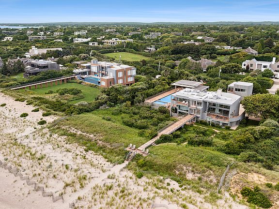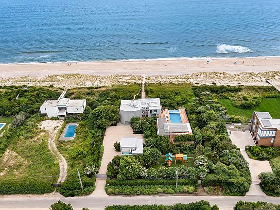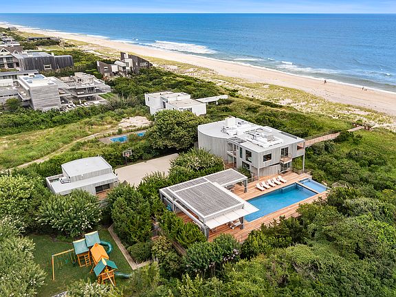feet of frontage. With naturally lit interiors, the residence affords ample living space including four ensuite bedrooms, each designed to maximize awe-inspiring water vistas. Presenting a truly unique oceanfront program, the exterior features an outdoor setup designed with entertaining in mind. Adjacent to the oversized waterside gunite pool and spa, an expansive outdoor kitchen area is equipped with two state-of-the-art grills, a gas pizza oven, and a refrigerator, while a private walkway offers direct access to the ocean beach. The main residence is accompanied by a three-car detached garage with gym and second-level studio, plus an additional one-car garage. Among the exterior amenities are two outdoor showers, a basketball hoop, and sprawling grounds with a separate area for the play-set and trampoline. Along with endless opportunities for recreation and relaxation, this oceanfront opportunity furnishes close proximity to Bridgehampton attractions and all the neighboring hamlets have to offer.