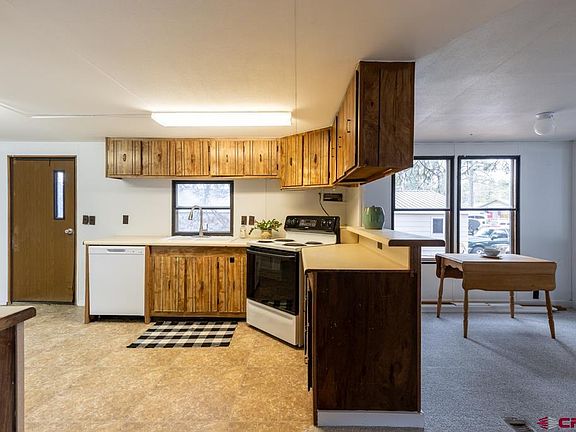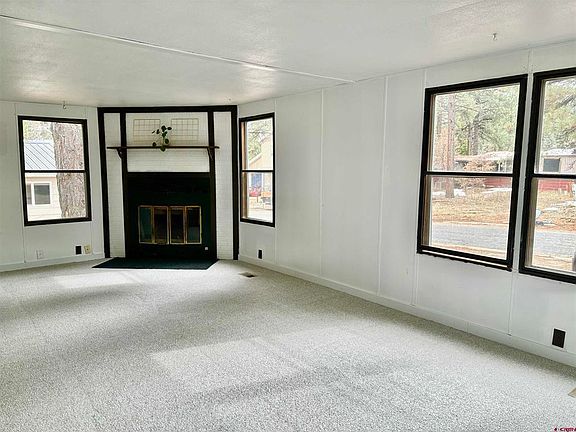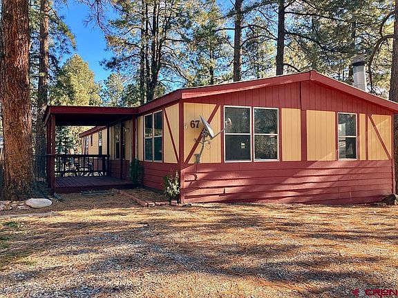 Escape to your mountain oasis in this freshly upgraded three-bedroom, 1.75 bath home, nestled within Durango West's whispering pine breezes. Outdoors, enjoy the covered front porch and large, partially fenced backyard, offering privacy as it borders neighborhood common space without immediate backyard neighbors. Inside, indulge in the modern comforts of new walls, fresh carpet, paint, and trim throughout, alongside brand-new appliances including a dishwasher and refrigerator. The living area is spacious with two sitting areas, plus a dining area, flooded with natural light from the many windows. The kitchen features a breakfast bar and ample space for a dining table, with the back deck accessible from the kitchen. Conveniently, washer and dryer hook-ups are located in the kitchen. Primary bedroom features an ensuite bathroom while a larger bathroom with soaking tub is in the hall. Plus, take advantage of neighborhood amenities like tennis courts and a park, perfect for outdoor recreation. With downtown Durango just a 10-minute drive away and City of Durango mountain trails nearby, convenience meets adventure at your doorstep. Discover this large, affordable purged manufactured home in the mountains, just 8 miles west of Durango, and only 10 minutes to town. Immerse yourself in the beauty and adventure of mountain living with quick access to hiking, biking, camping, and more at an affordable price. * New Water Line from M&R Plumbing * Furnace Recently Serviced by Gharrs * New Subfloors in 2 Bedrooms by LT Flooring * Screws Tightened on Roof by Exclusive Remodeling* New Electrical for Dishwasher and Refrigerator by Durango Electric * New Drywall and Texturing * New Paint * New Floor Trim * New Carpet * New Dishwasher * New Refrigerator * Buy with Assurance!