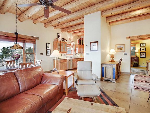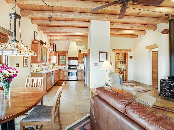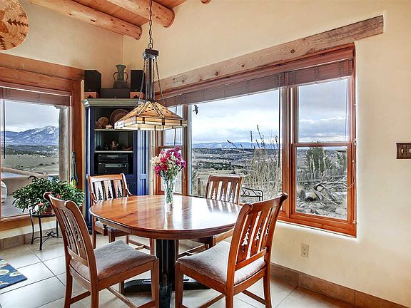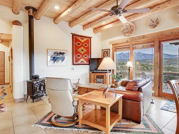 Stunning 360 degree views are just one of the many awesome features of this 2BD/2BA ridgetop home overlooking the Arroyo Hondo valley. Enjoy light, bright living spaces, with ample windows featuring mountain views, tile flooring and vigas throughout. Completed in 2011, the home was built with energy efficiency in mind, and includes grid-tied solar system sized for the home, efficient wood stove, and ceiling fans. The functional kitchen features leather-finish granite countertops, alder wood soft-close cabinets, and newer stainless steel appliances. The artist in you will love the separate, 120sf artist studio, plus additional studio space attached to the 2-car garage. Ample storage, including site build shed. Lovely and private outdoor living spaces include fountains and flowering summer gardens. Broadband is in place.