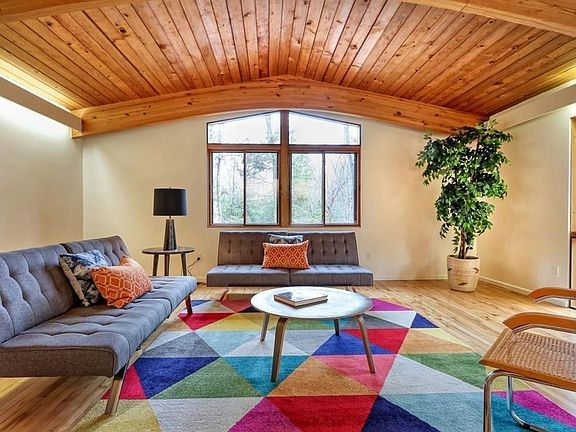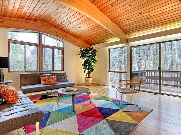 Enjoy expansive picturesque views of the changing seasons from this impressive mid-century modern home nestled high on a rare 2.8-acre lot. Period enthusiasts will appreciate the post-and-beam construction and original architectural details accentuated by an abundance of light from the oversized windows. This spacious five bedroom home offers refurbished baths, updated floors, and a sauna on the lower level. Original hardwood floors gleam throughout the living and dining room. Freshly painted throughout. Soak up the sun and fresh air and delight in the enchanting sounds of rustling trees and songbirds from your kitchen patio and living room deck. The new septic system offers notable savings on your town water bill. Great convenient location near Estabrook Elementary School, shopping, restaurants, fitness centers and more. Enjoy the convenience of the Lexpress Bus and the private neighborhood Paint Rock Pool.
