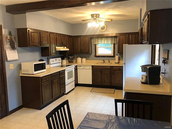 Cute city home two houses from West Park and only a few blocks from the lake and downtown! Home features large, eat-in kitchen that leads to back deck overlooking the yard. Kitchen offers large pantry and lots of storage. Living room and dining room downstairs make for easy living. Upstairs are 3 bedrooms. Master bedroom is huge, featuring his and hers closet space. Home has attractive front porch for enjoying the mornings, evenings, and all Oswego has to offer. New vinyl floors in bathrooms make clean-up a breeze. Full basement offers storage and heat. Use the basement for your own personal workshop. You won't want to miss out! Take advantage of easy city living and front porch sitting today!