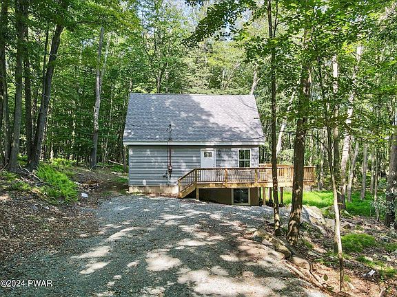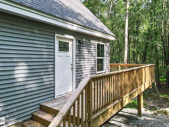 Welcome to your personal sanctuary in The Hideout--where luxury meets nature in perfect harmony. This spectacular home has been completely transformed into a modern masterpiece, offering you a fresh start in the heart of the Poconos. Imagine living in a space where everything is brand new, from the gleaming vinyl floors underfoot to the stunning vaulted ceilings above. Whether you're seeking peace and privacy or a vibrant community lifestyle, this home promises to deliver the ultimate escape from the everyday. Step inside to discover a bright, open-concept living area flooded with natural light. Expansive new windows frame the serene wooded views, while knotty pine tongue and groove vaulted ceilings add a warm, inviting atmosphere. Every detail has been thoughtfully updated, from the sleek new fixtures to the freshly painted walls that bring modern elegance to every room. This home is truly a masterpiece, boasting a brand new roof, vinyl siding, and a gorgeous new deck where you can enjoy the peaceful surroundings. The spacious living area flows effortlessly into four tranquil bedrooms, with two bedrooms and one bath on the main level, and two more bedrooms and a second bath upstairs. Each space is designed to offer comfort and style, making this home perfect for both relaxation and entertaining. And the possibilities don't stop there. The unfinished basement, already studded out and fitted with new windows, is a blank canvas ready for your vision--whether you dream of a cozy family room, home theater, or personal gym. Outside, your new deck is the perfect spot for morning coffee or evening gatherings, surrounded by the soothing sounds of nature. With direct access to The Hideout's pristine golf course and a wealth of community amenities--lakes, beaches, pools, a ski hill, and more--you're not just buying a home; you're embracing a lifestyle. Imagine yourself here, just two hours from the hustle and bustle of NYC and Philadelphia, yet a world away in your own private
