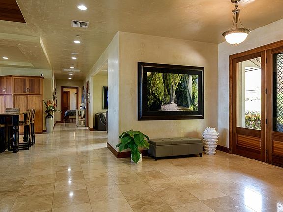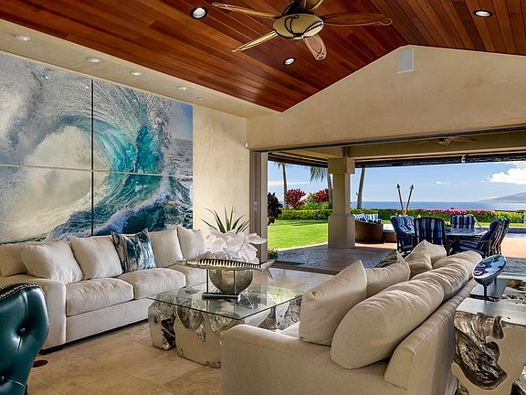 This alluring five-acre plus estate is situated on the most prime lot within Puunoa Estates and possibly West Maui. The property’s location and strategic landscaping provide absolute privacy. Puunoa is a prestigious gated community located just south of Lahaina Towne comprised of only 24 estate sites which are a minimum of five acres in size. Puunoa Estates’ owners could afford to live anywhere in the world but have chosen to make Puunoa their home. They are drawn to a lifestyle where summer never ends, remarkable beaches are easily accessible and outstanding views of the ocean, neighbor islands, West Maui Mountains, sunsets, and whale watching in season, create a dramatic setting to call home. 67 Wili Okai Way is a captivating property with many amenities not found on any other current offering on West Maui. The private driveway up to the estate is adorned with many stately royal palm trees that border stunning mountain and ocean views as one enters and exits the property. An exquisite water feature with tiki torches to light in the evening marks the entrance to this beautiful, stately single-level home. All five acres of land are fully manicured with native trees, plants and lush green lawn. The infrastructure includes a perfect location to construct an additional cottage (Ohana), as well as a free-standing barn, while maintaining the unobstructed views from the main residence. The approximately 425-foot elevation of this estate captures views of three neighbor islands, Kahoolawe, Lanai, and Molokai. Just below the property is the most beautiful stretch of a six-mile paved trail limited to pedestrians, bicyclists, and equestrians. The most significant investment unique to this property is a private water well, constructed in 2019, which provides both potable and non-potable water to the estate. The utility capacity of the well, capable of up to 400 gallons per minute of permanent pumping, gives an avid environmentalist owner much flexibility and the ability to explore possibilities of sharing water with others and possibly create income from this phenomenal amenity. The existence of the well creates significant savings compared to the alternative costs of water supply. The installation of a major photovoltaic solar field and additional solar panels on the back of the property give the estate tremendous energy efficiency by drastically reducing electric costs to the home and propane costs to heat the resort-style ceramic tiled pool and spa. Other exterior amenities include an outside gathering place complete with fire feature and expansive decks for outdoor living, relaxing, or entertaining; a 15-foot private personal roadway around the complete perimeter of the property for caretakers’ easy access; extensive decorative and retaining walls; fully mature landscaping including a variety of palms, a citrus grove and other colorful floral hedges; a home generator; high output fire hydrant spigots at both the home and garage; a fire hose; and private outdoor shower. Interior amenities include a six-zoned air conditioning system enabling customized interior climate control, sprinkler system inside both the home and the garage, security system, high quality interior and exterior sound system, water softening and purification system, and American Security wall safe. Above and beyond the actual amenities of this striking property, the special personality of the property is compelling. Included in the sale of this estate, is an extensive iconic collection of master photographer Peter Lik. The presence of his art creates a powerful and emotional back drop within the main residence. Detailed information to be provided upon request. A discerning buyer will immediately recognize all that sets this lovely property apart.