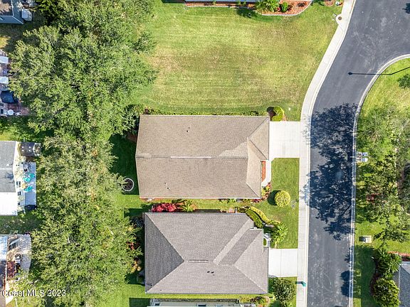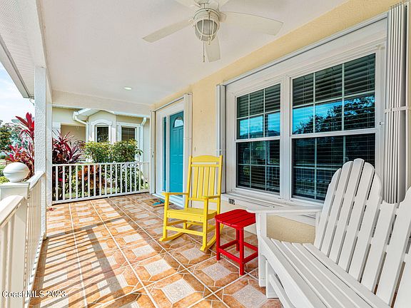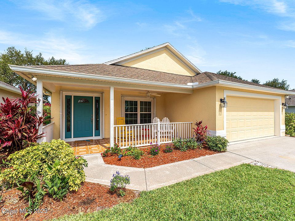 WHAT A CHARMING HOME! Conveniently located in the desirable 55+ gated community of Compass Pointe, this 3BR/2BA home offers vaulted ceilings for a light and airy feel, plus a great front porch with views of the lake across the way! Recent updates include appliances(2020), tile backsplash & quartz countertops(2022), W/H & HVAC(2021), Guest Bath renovated w/ shower, LVP flooring in bedrooms(2020)-no carpet in this home! Plus a new roof is in the process of being installed! Equipped with w/accordion shutters & the garage was extended by approximately 2-3ft. The spacious primary offers his & her walk-in closets, double sinks & walk-in shower in the bathroom. Relax on the enclosed lanai, complete w/ tile flooring plus a 220 plug for a hot tub. Amenities include a screened heated pool & spa, exercise room, putting green,shuffleboard, bocce court & more. Close to shopping, dining & the beaches, don't miss this chance to experience Florida living at its finest!