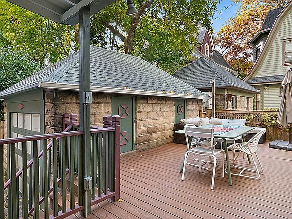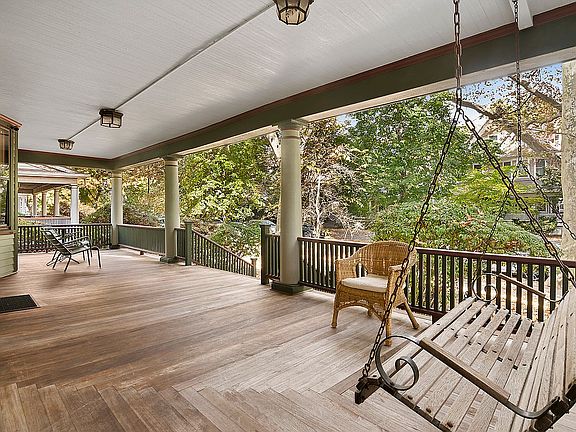 The property includes a wraparound front porch, a back patio with a garden, and a full basement with a recreation room and in-unit washer and dryer. The primary suite offers a dressing area, and the additional rooms provide flexibility for a home office or other uses.