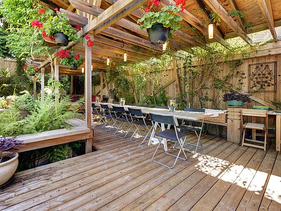 Handcrafted windowsOak floorsVaulted ceilingsFive total bathsDetached studioGrand pergola