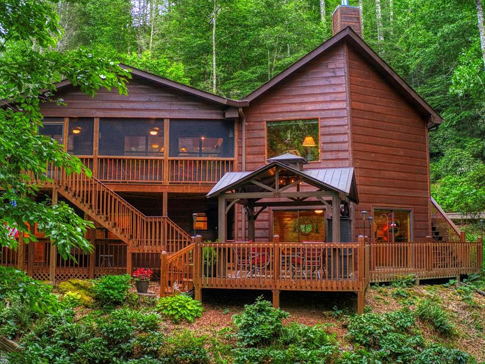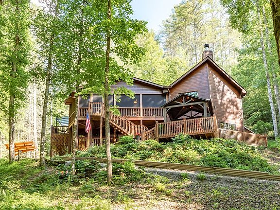 Spacious and comfortable private cabin is ready for family and friends. This creek front home has two primary suites upstairs and a large fully furnished downstairs with full bath, two sleeping quarters (no windows) and a kitchenette. Home is being sold fully furnished with many one-of-a-kind furnishings. Sale includes UTV & kayaks. Expansive decks, T&G interior, screened in porch and hot tub provide so many places to relax and enjoy. Lots of hardscapes, landscaping and wildlife in this special find.