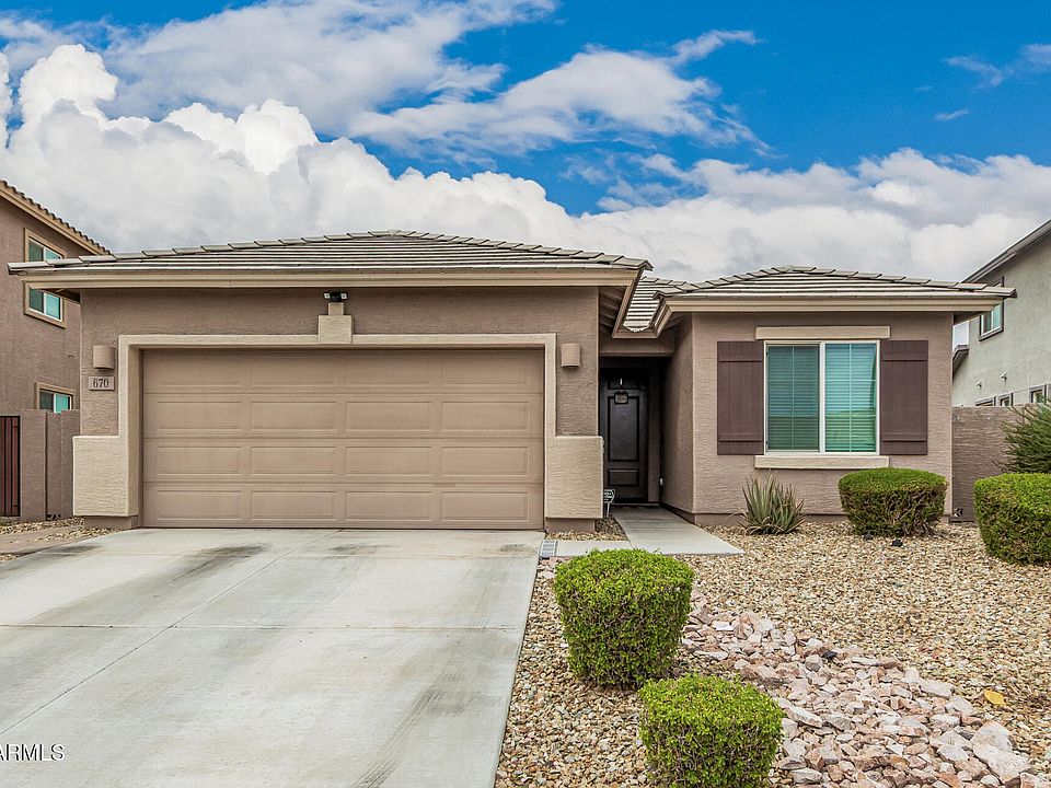 Welcome to this charming home in the desirable Blue Horizons! Providing 3 beds, 2 baths, 2-car garage, & a well-manicured landscape. The interior exudes refined style with tons of natural light, a neutral palette, modern light fixtures, tall ceilings, and wood-look tile flooring throughout. You'll love the seamlessly open layout, allowing a greater traffic flow! The impressive kitchen boasts black SS appliances w/wine cooler, quartz counters, gray shaker cabinetry, a pantry, and a 2-tier peninsula w/breakfast bar. The primary bedroom has sliding doors to the back and an ensuite with dual sinks & a walk-in closet. If you want to relax or have a fun gathering, the spacious backyard awaits! A cozy covered patio, multiple seating areas, and artificial turf complete the picture. Make it yours!