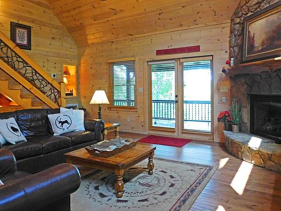 Watch the RIVER from the porch! This beautiful cabin is tucked away yet close to town. Almost 2 acres that offer River Front and VIEWS! SOLD FULLY FURNISHED! Master on main with a huge en suite, Jetted tub and separate shower. Large great room with Vaulted ceilings and lots of natural light. Main level deck showcases the river bend view, outdoor dining and a fireplace. 2 bedrooms up stairs with Jack & Jill bath and a private deck overlooking the River Bend View. The Fully finished basement offers 10 foot ceilings, the 4th bedroom, 3rd bath, huge game room setup with a media area, pool table, card table and wet bar. Terrace level deck hosts a hot tub and more outdoor entertaining space. Steps down to the Private RiverFront and to a firepit area. This house has everything! Was on the rental market.