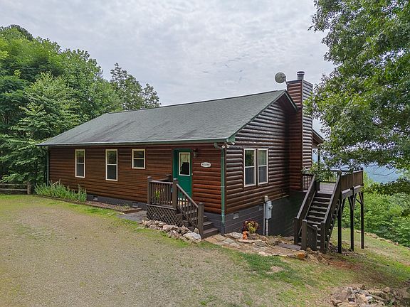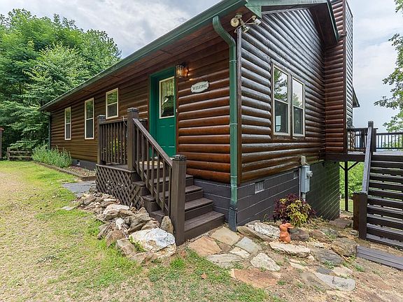 Completely private 2 bedroom 2 bath log sided cabin with year-round long range mountain views. Home features a cozy great room with wood burning fireplace, tongue & groove wood cathedral ceiling and walls, hardwood floors and large windows to take in the beautiful mountain view. The kitchen has custom cabinets, an island, granite countertops and stainless steel appliances. Owners' suite offers a bath with shower and garden tub and a walk-in closet. Second bedroom has direct access to the second bath which also houses the laundry area.  Solid wood 6 panel interior doors. Covered porch and open deck to enjoy the views and watch the abundant wildlife. The crawl space is tall and partially floored, allowing space for storage or a workshop. Storage building at the driveway level. Home and storage building have been newly stained. Whole house water filtration system.  River Street internet. Common area park with pavilion, grills and a babbling creek. Owner occupied. Please call listing agent for appointment.
