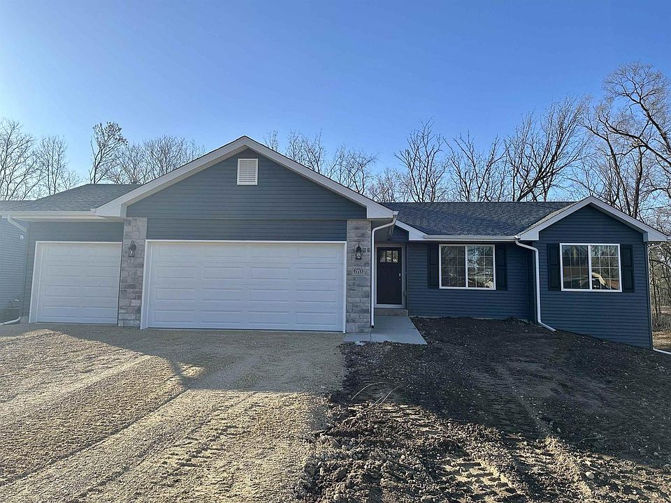 Welcome to this attractive 3 bed, 2 bath ranch w a 3-car garage, offering 1,264 sq ft of comfortable living space. Step into the open & inviting great room w a cathedral ceiling, beautiful luxury vinyl plank flooring & white trim throughout. Bedrooms feature upgraded carpet & padding for added comfort. Kitchen is a highlight, featuring plenty of storage, breakfast bar, granite counters, & SS appliances. Primary suite includes a private bathroom with double sinks & a walk-in closet. Basement is ready for your personal touch, with an Egress window & plumbing for a 3rd bath. Home is built with 2x6 construction & 90% efficient furnace for energy efficiency. Includes 12x12 deck & a blacktop driveway & vinyl siding in a stylish deep water color w/bergundy shutters