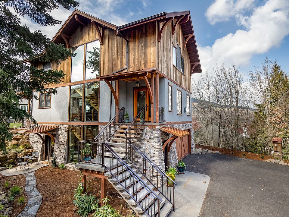 Handcrafted home offers unparalleled craftsmanship! Stucco, stone & staggered board exterior with old world timber peg. Light from tower windows showoff builders signature stairs & custom railing. Hand milled fir floors throughout. Gourmet kitchen with island, veined concrete counters, custom cabinets. Spacious open floor plan. Master suite offers heated floor, soak tub w/ picture window, STUNNING open shower with custom concrete scene. Downstairs suite w/private patio & bath. Truly a must see!