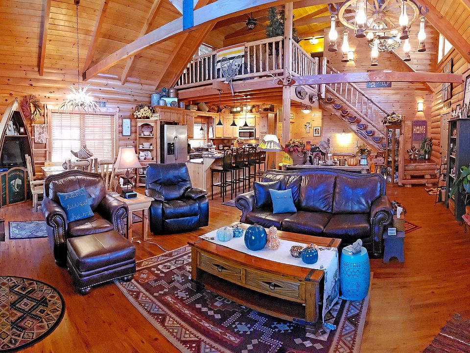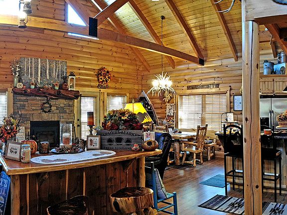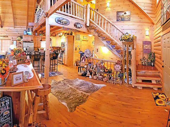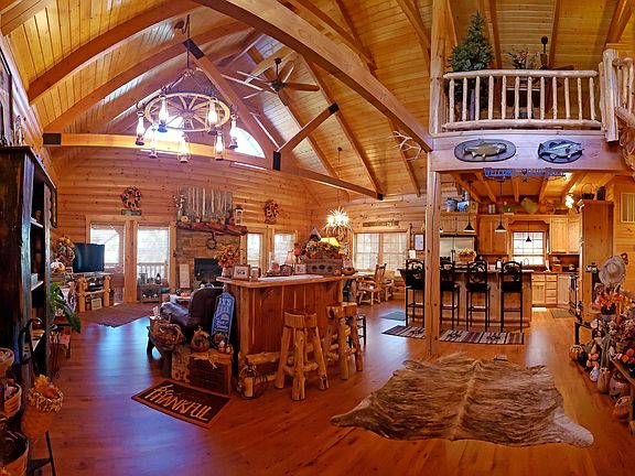 The owner of this custom Log Home spared no expense when it came to design details. From the post and beam construction, to the Antler and wagon wheel light fixtures, this home offers an upscale lodge ambiance that will just make you feel special. The spectacular Great Room features s soaring cathedral, designer stone fireplace, and natural wood flooring. Several of the unique furnishings such as the rustic wood dining set and custom built bar are included in the offering. The kitchen features quartz counters with rough cut edges that blends perfectly with the cabin motif. The rustic luxury design is carried throughout the home and each room offers it's own blend of rustic charm. There is an unfinished basement with plumbing for a 4th bath and if you like outdoor living, you will love the