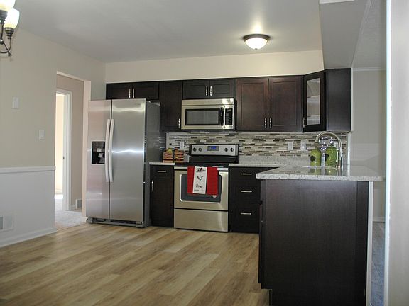Great floorplan and updates galore in this move-in-ready remodeled home. Must see photos! The spacious eat in kitchen opens to the family room. The ''new list'' is long- cabinets, granite countertops, glass tile backsplash, sink with garbage disposal, floors and new stainless steel appliances including a built-in dishwasher. Both bathrooms have new vanities, fixtures, and tile floors. The bath/shower has a luxury shower head and new tile wainscot. There are also new energy efficient windows, a new high efficiency HVAC system, & water heater. The finished basement has 3 more large finished rooms. In the back, there is a covered porch, a large concrete patio, and a spacious yard. Trees are allowed on common land behind the house.